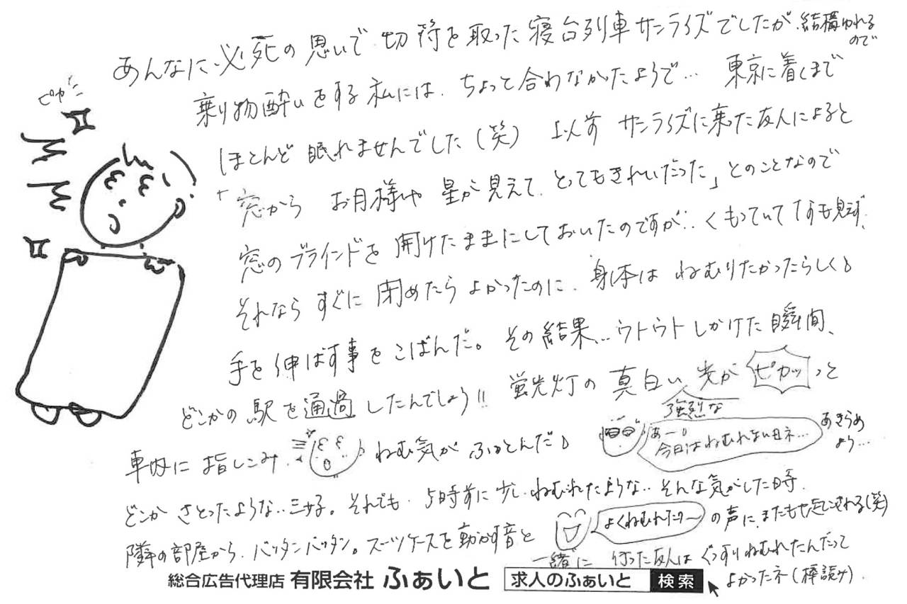 眠れませんでした(笑)以前サンライズに乗った友人に